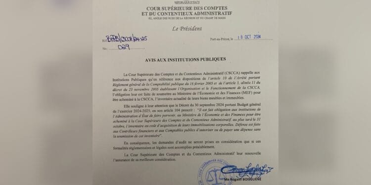 La CSCCA souligne que cet inventaire doit être transmis au plus tard le 31 octobre 2024, dans le cadre du budget pour l’année 2024-2025. Cette mesure vise à améliorer la planification des finances publiques et à assurer une gestion rigoureuse du patrimoine de l’État.