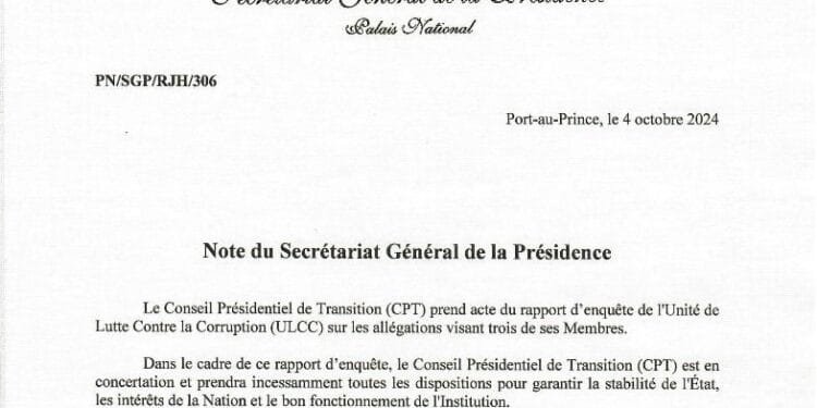 Le Conseil Présidentiel de Transition (CPT) a pris connaissance du rapport d’enquête récemment publié par l’Unité de Lutte Contre la Corruption (ULCC), qui fait état d’allégations de corruption concernant trois de ses membres.