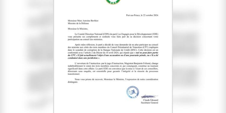 Le parti Les Engagés pour le Développement (EDE) appelle à une action forte contre le scandale de corruption qui touche la Banque Nationale de Crédit (BNC) et secoue la scène politique haïtienne. Le Comité Directeur National (CDN) du parti a récemment demandé au Ministre de la Défense Marc Antoine Berthier de ne plus assister aux réunions du Conseil des Ministres auxquelles participent les trois membres du Conseil Présidentiel de Transition (CPT) soupçonnés dans cette affaire.