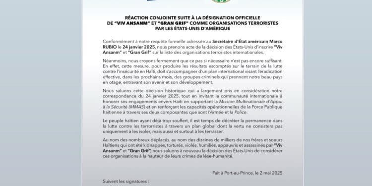 Les initiateurs de l’Accord du 21 décembre et les responsables du parti politique EDE se félicitent de la décision des États-Unis d’Amérique d’inscrire les groupes armés Viv Ansanm et Gran Grif sur la liste des organisations terroristes internationales. Cette reconnaissance fait suite à une requête formelle adressée au secrétaire d’État américain Marco Rubio, en date du 24 janvier 2025.